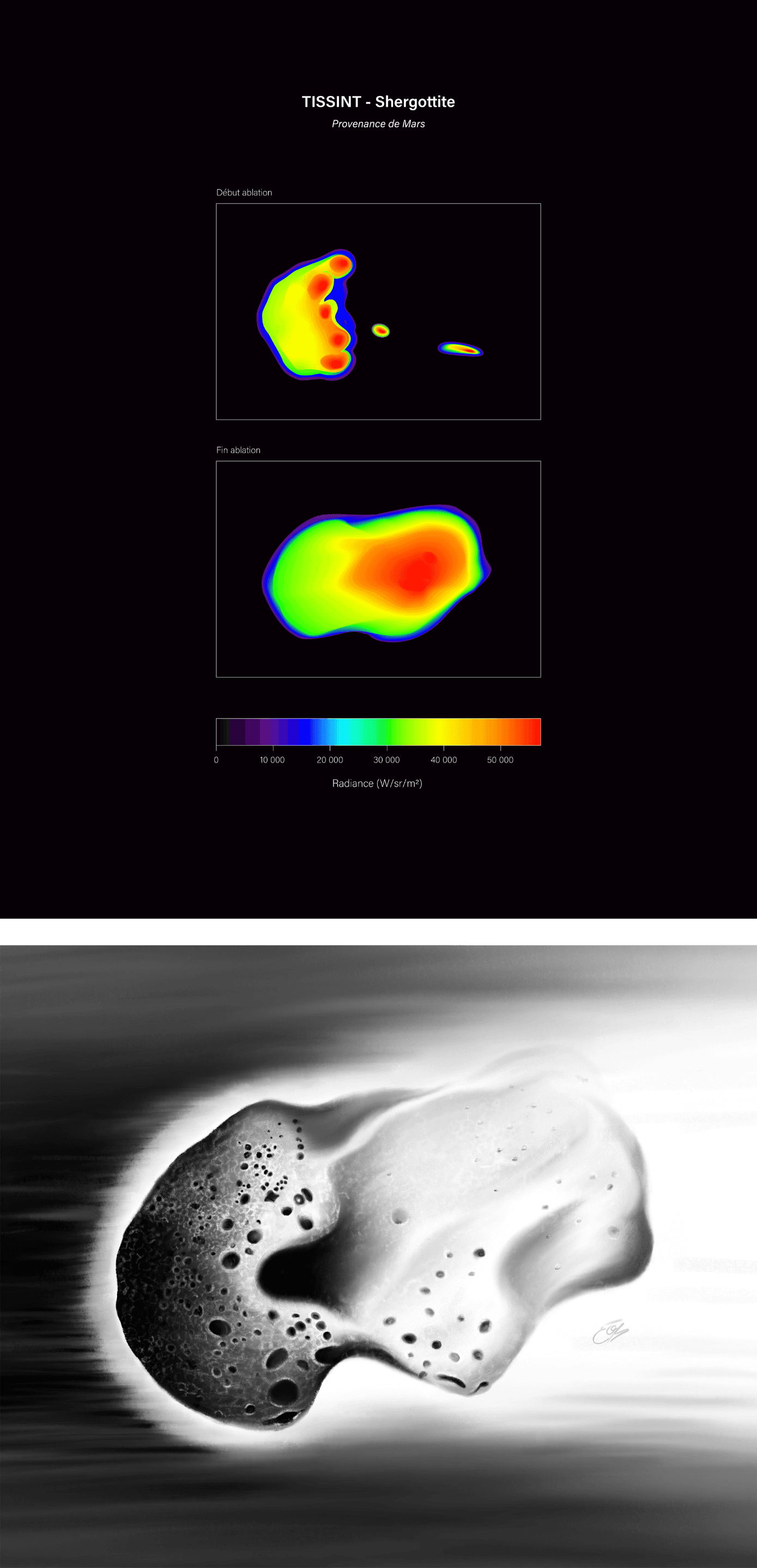Parallèlement, j'ai étudié le comportement de différentes météorites, dont la météorite de Tissint, subissant une ablation thermique avec des conditions reproduites en laboratoire selon l'article de Grigat et al., 2024.*